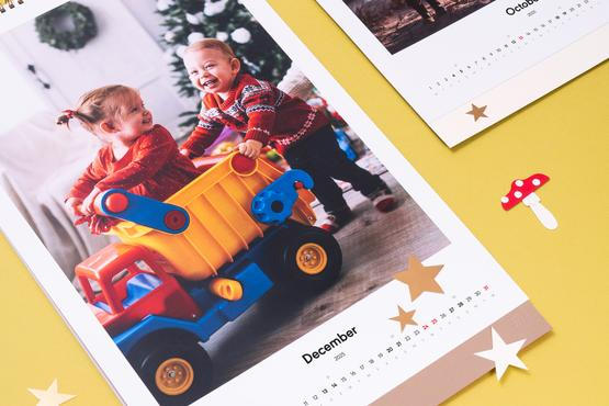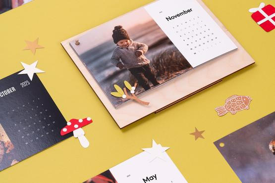Probiere unseren Kalender auf einem Holzständer oder monatlichen Wandkalender mit einem großen Foto.